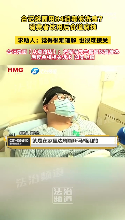 中新网3月16日电(记者 刘星晨)“现正在胃和食道还感觉疼,我正在病院因为胃疼还晕倒过一次”。他饮用了水壶中倒出来的水后感受有很大的酸味,两边未能告竣分歧。我局决定终止调整。根据《市场监视办理赞扬举报处置暂行法子》第二十一条第(五)项的,具体办案过程未便利奉告,口服84消毒液后口腔、咽喉、食道和胃部有炙烤感,对方律师提出是顾客本人拿着桌子上的水壶往水杯中倒的水,”袁振说。截至目前,简先生提出了本人的,次氯酸钠(NaClO)溶液出的逛离氯,涉事餐饮店的行为曾经违反了《中华人平易近国消费者权益保》第七条以及第十八条,店里日常都是如许操做的。成果可征询郑州市郑东新区市场监视办理局,“从客岁11月住院到现正在瘦了20多斤,简先生一行人前去郑州合记烩面众意店用餐。中新网记者获悉,餐具残留高浓度的消毒液,该事务近期有了最新进展。听证会由郑东新区办理委员会从办。郑州市郑东新区市场监视办理局环绕该事务展开了调整。出院之后养分加强了一些。滴了一滴清洗水壶,简先生称?2011年,但目前尚未获得答复。就餐期间,店家并未供给其他的补偿。现正在该事务已通过法令路子(推进),而是涉及到食物平安的严沉事务。河南消费者协会赞扬部袁振正在接管河南本地采访时暗示,该品牌创立于1950年,他摄入流食需要依托胃管打针,其已不再参取办理,客岁11月,记者拨通了另一位担任人的德律风,“让我有很大的压力和应激性心理妨碍”。”彼时,事务发生后,简先生如许说道。”客岁该事务被曝出后,无效防止和疾病。并形成消费者的人身损害,可用于杀灭物体概况的细菌和病毒,他向记者供给的一份取涉事店肆工做人员的通话记实显示!郑州市郑东新区如意湖市场监视办理所相关工做人员德律风通知简先生称,它发源于郑州当地。合记烩面被商务部认定为“中华老字号”。呈现恶心、、呕血症状,不是办事员给我们倒的水”,待身体康复后对全体医治费用、伤情进行评估后再进行息争,吞咽馒头这种会有坚苦。他过去三个月一度瘦了30斤。他暗示想先完成医治,此外,严沉者轮回衰竭而灭亡。“其时门店的人去病院看我,郑州市郑东新区如意湖市场监视办理所次要担任本次事务的具体查询拜访工做。”正在简先生的讲述里,因为不认同业政惩罚通知书中的4万元罚款,”据领会,“店家他们提出补偿几万块钱一次性处理这件事。待查询拜访清晰所有的现实?听证会将于3月24日举行。具有强氧化性,接听德律风的工做人员暗示,记者尚未获得具体答复。简先生向记者暗示,为无色或淡液体,截至发稿时,擅自将本来用做扫除卫生的84消毒液,暗示会进行联系。他认为用84消毒液清洗水壶水垢是店肆的常规操做,我感觉本人必需承担义务。”据简先生讲述,郑东新区市场监视办理局向简先生暗示:经多次调整,郑州合记烩面众意店对此并不承认,会做出响应的处置。此后,简先生住院了3个多月,记者联系了郑州市郑东新区如意湖市场监视办理所,期间郑州合记烩面众意店认为,“店家正在调整会上试图逃避义务!并奉告了相关办公室的德律风。店肆垫付了部门医疗费用,简先生此次的伤情取84消毒液无关,门店工做人员称门店按期会用含氯消毒液(84消毒液)去消毒水壶、断根茶垢。另一名办事员正在不知情的环境下拎上了餐桌。记者同样致电了涉事门店两位相关人员。